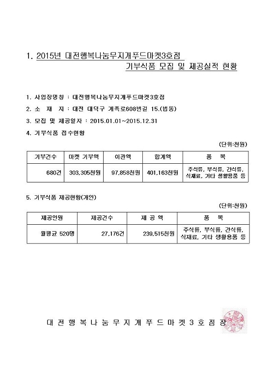 19-03-28 11:27 대전행복나눔무지개푸드마켓3호점 2015년 기부식품 모집 및 제공실적 현황 페이지 정보 작성자 성우보육원 댓글 0건 조회 4,747회 본문 2015년 기부식품 모집 및 제공실적 현황 목록 댓글목록 댓글목록 등록된 댓글이 없습니다.