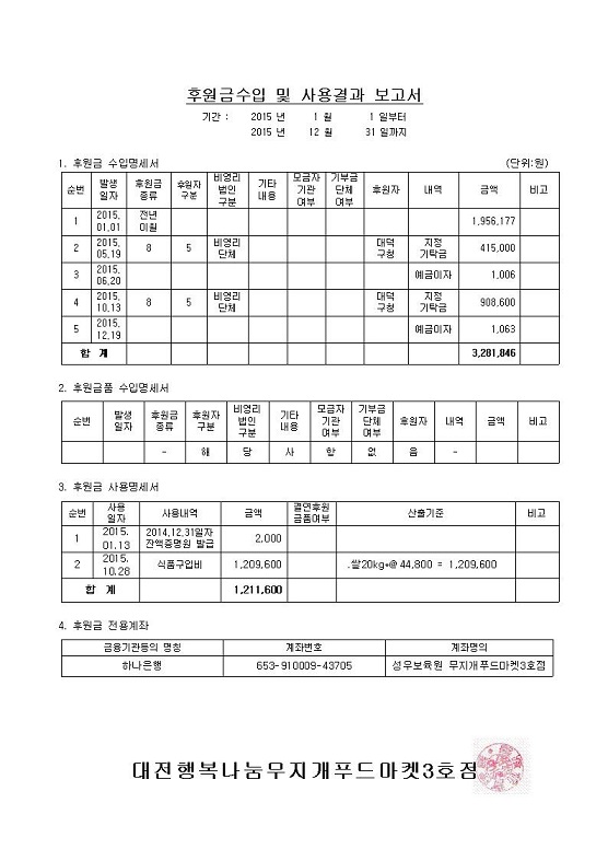 19-03-28 11:27 대전행복나눔무지개푸드마켓3호점 2015년 후원금 수입 및 사용결과 페이지 정보 작성자 성우보육원 댓글 0건 조회 4,600회 본문 2015년 후원금 수입 및 사용결과 공고 목록 댓글목록 댓글목록 등록된 댓글이 없습니다.