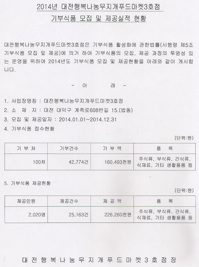 19-03-28 11:04 2014년도 대전행복나눔무지개푸드마켓3호점 기부식품 모집 및 제공실적 공고 페이지 정보 작성자 성우보육원 댓글 0건 조회 4,070회 본문 2014년도 대전행복나눔무지개푸드마켓3호점 기부식품 모집 및 제공실적 공고 목록 댓글목록 댓글목록 등록된 댓글이 없습니다.