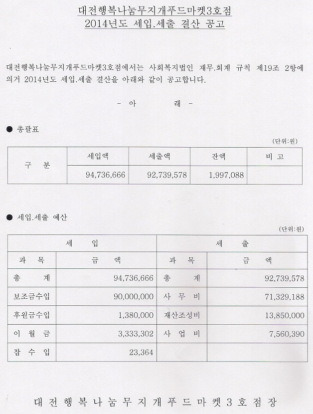19-03-28 11:19 대전행복나눔무지개푸드마켓3호점 2014년도 세입.세출 결산공고 페이지 정보 작성자 성우보육원 댓글 0건 조회 4,349회 본문 대전행복나눔무지개푸드마켓3호점 2014년도 세입.세출 결산공고 목록 댓글목록 댓글목록 등록된 댓글이 없습니다.