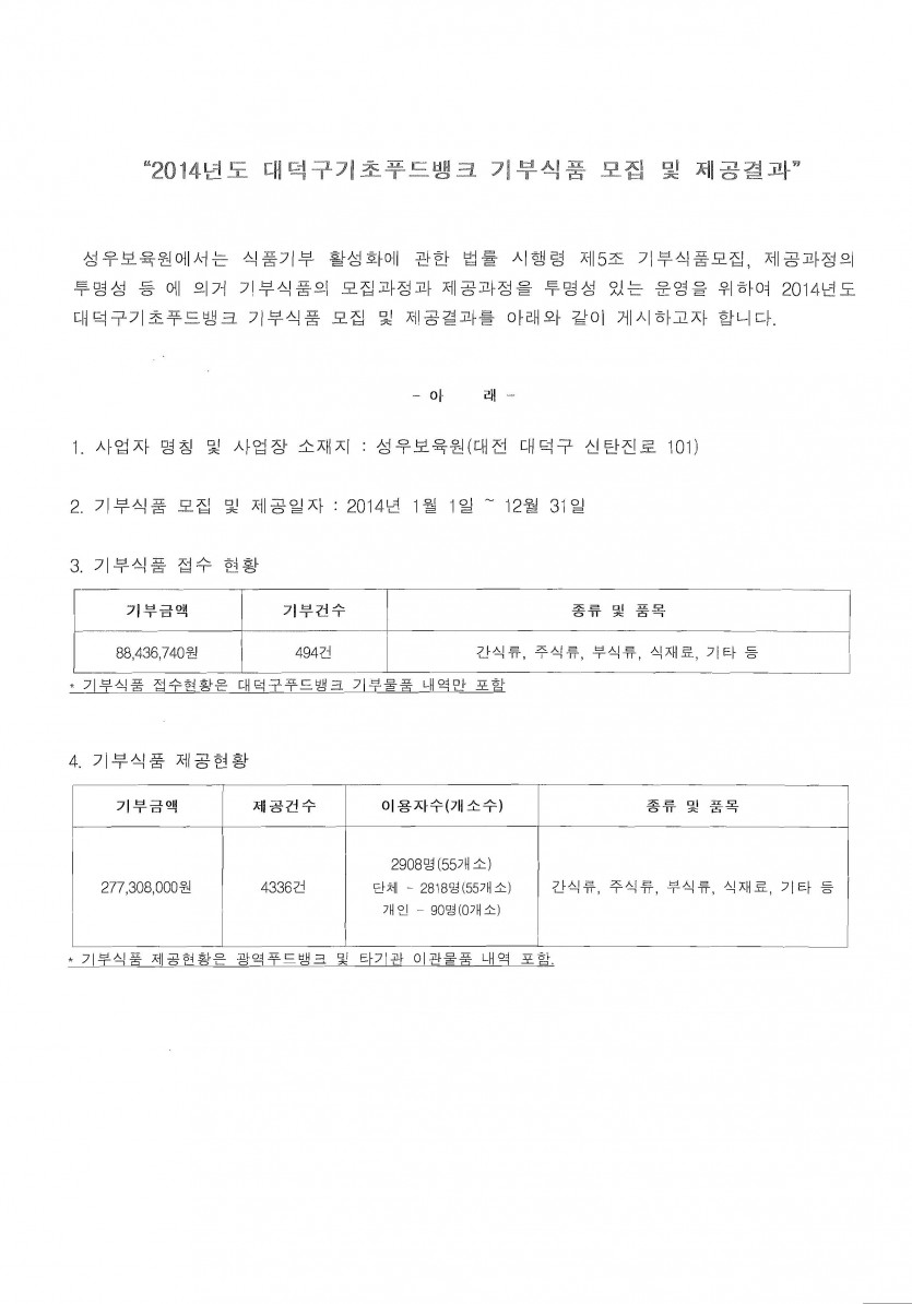 19-03-28 11:21 2014년 대덕구기초푸드뱅크 운영실적(기부식품 모집 및 제공결과) 페이지 정보 작성자 성우보육원 댓글 0건 조회 4,779회 본문 2014년 대덕구기초푸드뱅크 운영실적(기부식품 모집 및 제공결과) 을 게시합니다. 목록 댓글목록 댓글목록 등록된 댓글이 없습니다.
