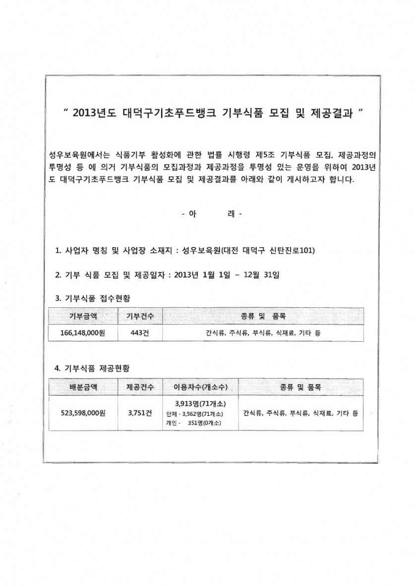 2013년 대덕구기초푸드뱅크 운영실적(기부식품 모집 및 제공결과) 작성일 19-03-28 11:00 페이지 정보 작성자성우보육원 조회 4,576회 댓글 0건 본문 2013년도 대덕구기초푸드뱅크 운영실적(기부식품 모집 및 제공결과)을 게시합니다. 댓글목록 댓글목록 등록된 댓글이 없습니다.