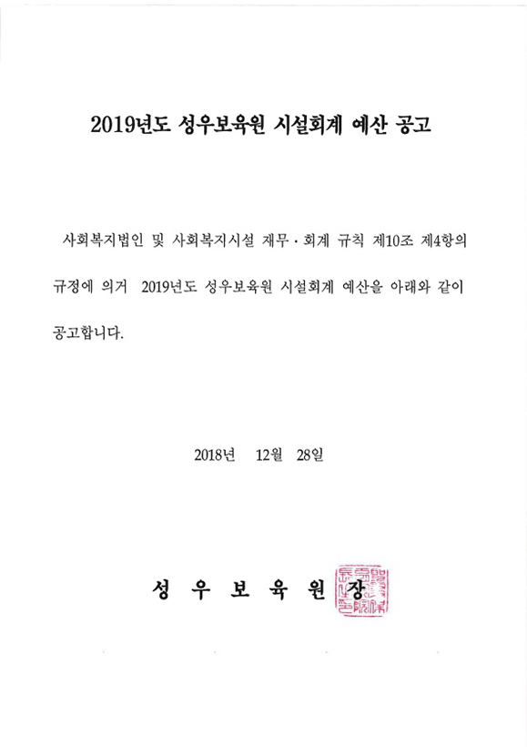 18-12-28 11:48 (공고) 2019년도 성우보육원 시설회계 예산 페이지 정보 작성자 성우보육원 댓글 0건 조회 4,851회 본문 2019년도 성우보육원 시설회계 예산 공고입니다. 목록 댓글목록 댓글목록 등록된 댓글이 없습니다.