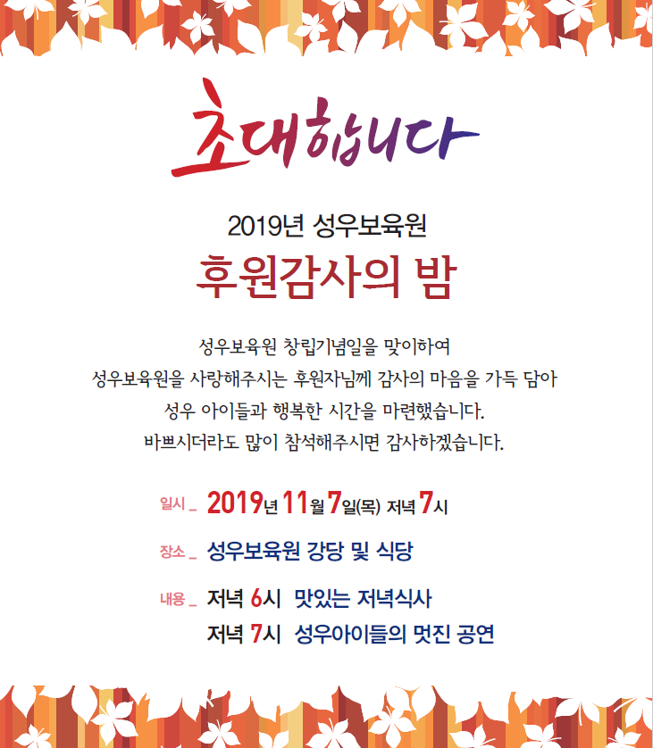 19-10-24 14:59 (초대합니다) 2019년 성우보육원 후원감사의 밤 (11월 7일 오후7시) 페이지 정보 작성자 성우보육원 댓글 0건 조회 4,532회 본문 2019년 성우보육원 후원감사의밤 많은 참석부탁드립니다! 목록 댓글목록 댓글목록 등록된 댓글이 없습니다.