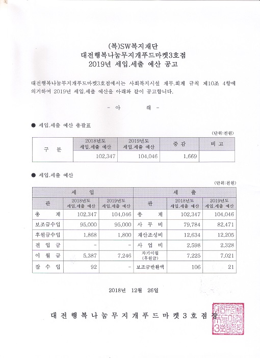 19-03-28 11:48 2019년도 대전행복나눔무지개푸드마켓3호점 세입.세출 예산공고 페이지 정보 작성자 성우보육원 댓글 0건 조회 4,271회 본문 2019년도 대전행복나눔무지개푸드마켓3호점 세입.세출 예산공고 목록 댓글목록 댓글목록 등록된 댓글이 없습니다.