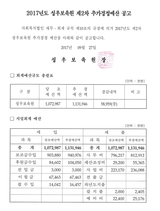 19-03-28 11:40 (공고)2017년도 제2차 추가경정 예산 페이지 정보 작성자 성우보육원 댓글 0건 조회 4,782회 본문 2017년도 제2차 추가경정 예산 목록 댓글목록 댓글목록 등록된 댓글이 없습니다.