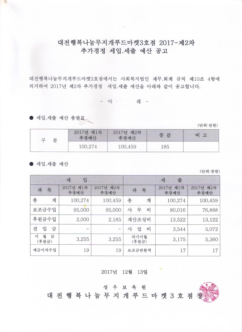 19-03-28 11:41 (공고)대전행복나눔무지개푸드마켓3호점 2017-2차 추가경정 세입.세출 예산공고 페이지 정보 작성자 성우보육원 댓글 0건 조회 5,115회 본문 (공고)대전행복나눔무지개푸드마켓3호점 2017-2차 추가경정 세입.세출 예산공고 목록 댓글목록 댓글목록 등록된 댓글이 없습니다.