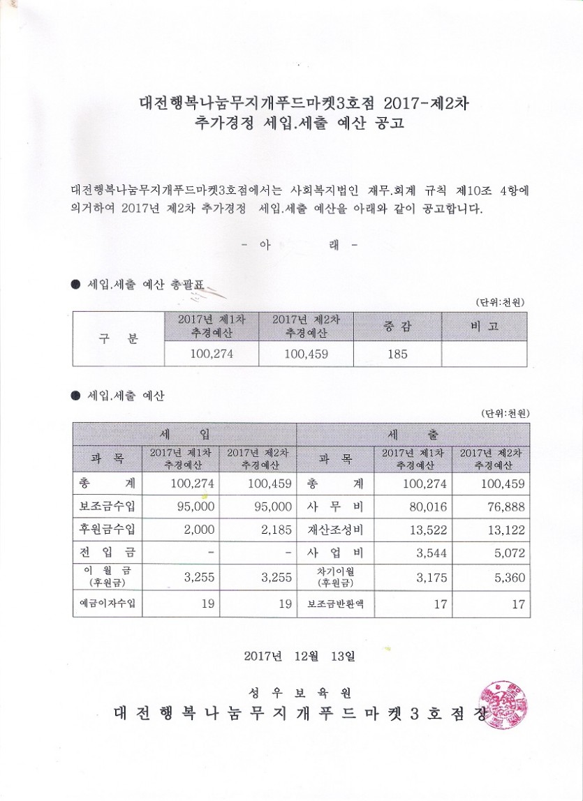 19-03-28 11:41 (재공고)대전행복나눔무지개푸드마켓3호점 2017-2차 세입.세출 추가경정 예산공고 페이지 정보 작성자 성우보육원 댓글 0건 조회 4,618회 본문 (재공고)대전행복나눔무지개푸드마켓3호점 2017-2차 세입.세출 추가경정 예산공고 목록 댓글목록 댓글목록 등록된 댓글이 없습니다.