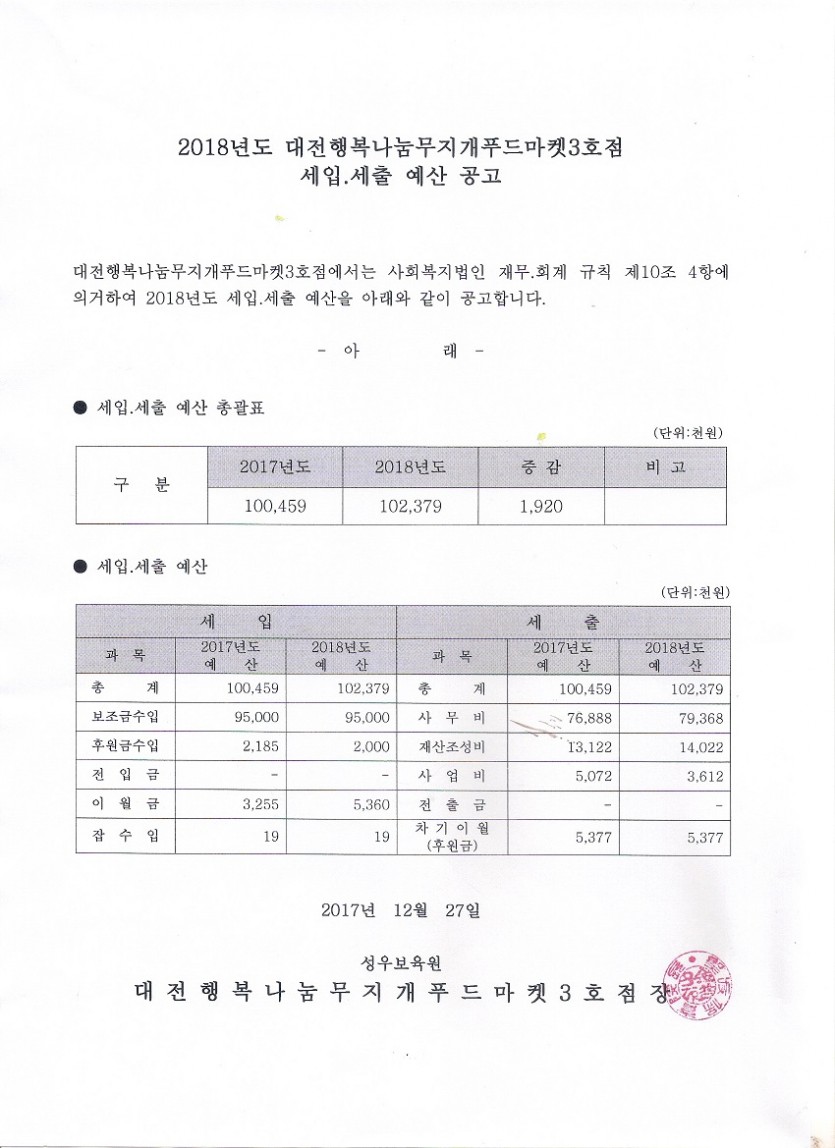 19-03-28 11:42 대전행복나눔무지개푸드마켓3호점 2018년도 세입.세출 예산 공고 페이지 정보 작성자 성우보육원 댓글 0건 조회 4,780회 본문 대전행복나눔무지개푸드마켓3호점 2018년도 세입.세출 예산 공고 목록 댓글목록 댓글목록 등록된 댓글이 없습니다.