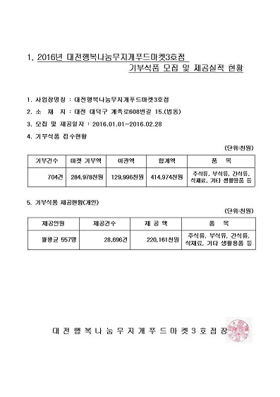 19-03-28 11:36 2016년 대전행복나눔무지개푸드마켓3호점 기부식품 모집 및 제공실적 현황 페이지 정보 작성자 성우보육원 댓글 0건 조회 4,555회 본문 2016년 대전행복나눔무지개푸드마켓3호점 기부식품 모집 및 제공실적 현황 목록 댓글목록 댓글목록 등록된 댓글이 없습니다.