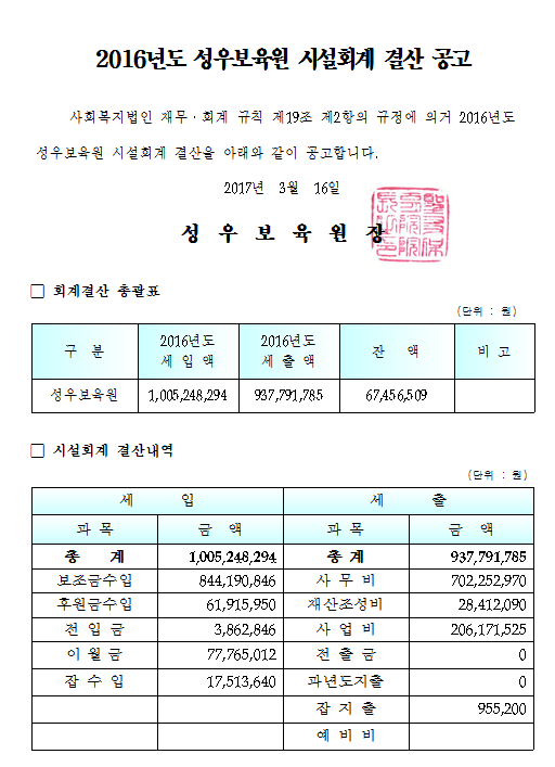 19-03-28 11:37 (공고)2016년 시설회계 결산 페이지 정보 작성자 성우보육원 댓글 0건 조회 4,991회 본문 2016년 시설회계 결산 목록 댓글목록 댓글목록 등록된 댓글이 없습니다.