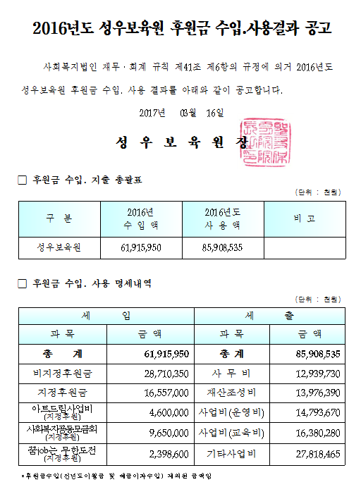 19-03-28 11:37 (공고) 2016년 후원금 수입 및 지출명세서 페이지 정보 작성자 성우보육원 댓글 0건 조회 4,761회 본문 2016년 후원금 수입 및 지출명세서 목록 댓글목록 댓글목록 등록된 댓글이 없습니다.