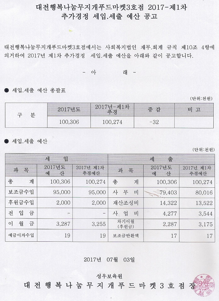 19-03-28 11:39 대전행복나눔무지개푸드마켓3호점 2017-1차 추가경정 세입.세출 예산서 페이지 정보 작성자 성우보육원 댓글 0건 조회 4,749회 본문 대전행복나눔무지개푸드마켓3호점 2017-1차 추가경정 세입.세출 예산서 목록 댓글목록 댓글목록 등록된 댓글이 없습니다.