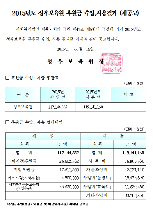 19-03-28 11:31 (재공고) 2015년 후원금 수입 및 지출명세서 페이지 정보 작성자 성우보육원 댓글 0건 조회 4,906회 본문 2015년 후원금 수입 및 지출명세서 목록 댓글목록 댓글목록 등록된 댓글이 없습니다.