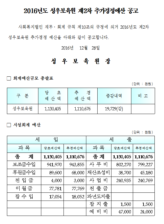 19-03-28 11:33 2016년 제2차 추가경정 예산 공고 페이지 정보 작성자 성우보육원 댓글 0건 조회 5,155회 본문 2016년 제2차 추가경정 예산 공고 목록 댓글목록 댓글목록 등록된 댓글이 없습니다.