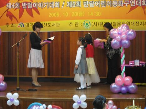 2006.10.22 10월 20일 반달이야기 대회 페이지 정보 작성자 성우보육원 댓글 0건 조회 1,439회 본문 10월20일(금요일)반달 동화구연이 안산도서관 시청각실 1층에서 있었습니다. 목록 댓글목록 댓글목록 등록된 댓글이 없습니다.